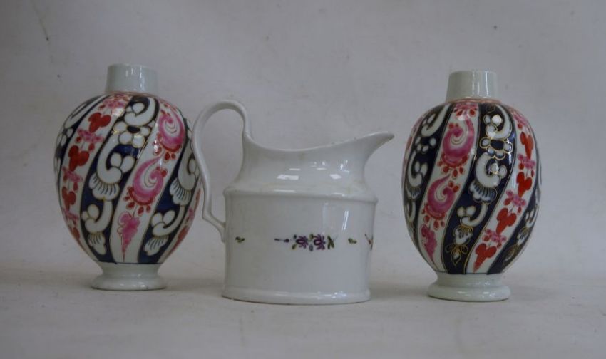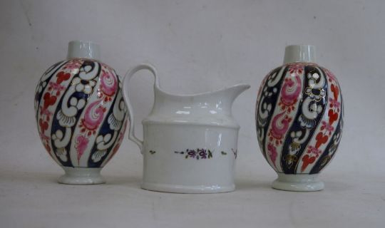 Two 18th century Worcester porcelain tea canisters, Queen Charlotte pattern, ovoid and each on circular foot with pseudo-Chinese seal mark, 12.5cm and 13cm high and an 18th century English porcelain oval cream jug with running floral inner border, decorated handle and floral spray decorated to the body and shouldered, possibly Newhall, no.136 to base, 10.5cm high (3) Condition ReportTea Canisters: Some scratches to patterns. Base wear and general wear. Marks pictured.Jug: Hairline cracks or glaze cracks on top half. Seem/crack to handle top connection. Manufacture fault or crack to spout.