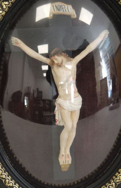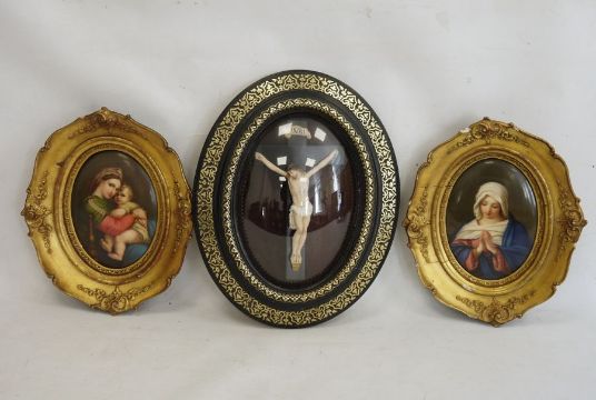 Pair of 19th century Berlin porcelain plaques, oval, one after Raphael 'Madonna Della Sedia' and the other of Madonna in prayer, each 17cm x 12cm, in oval gilt frames, one with number stamp to reverse '793' and a 20th century composition crucifix in black and gilt oval frame, 36cm x 29cm (3)