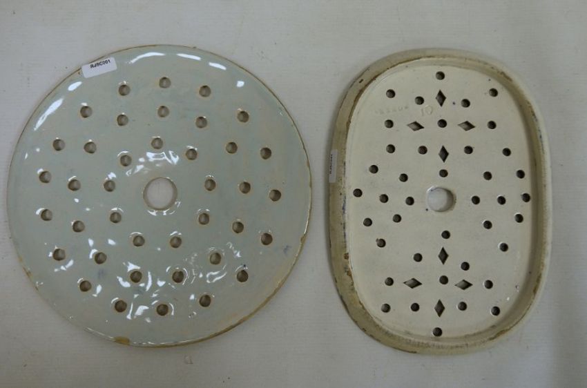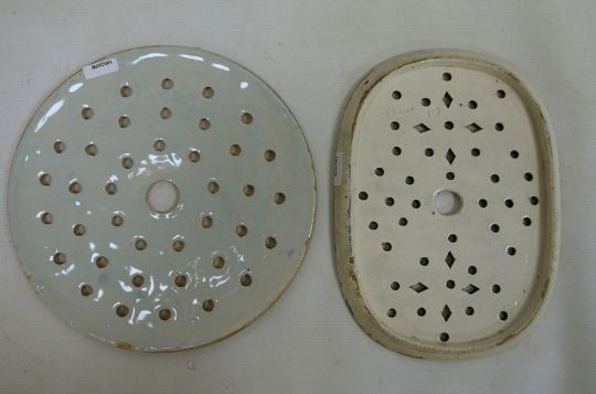 Two blue and white meat drainers, one marked 'Reed' to reverse and a possibly Middle Eastern blue and white charger (3)