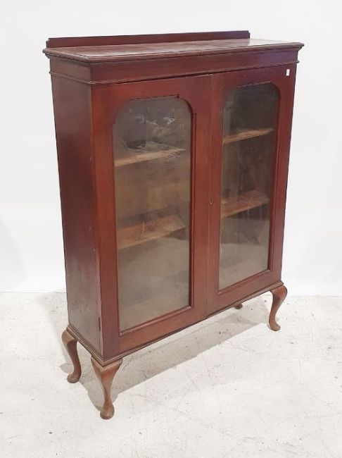 20th century mahogany two-door glazed cabinet, the rectangular top with moulded cornice above two glazed doors enclosing shelves, on cabriole legs