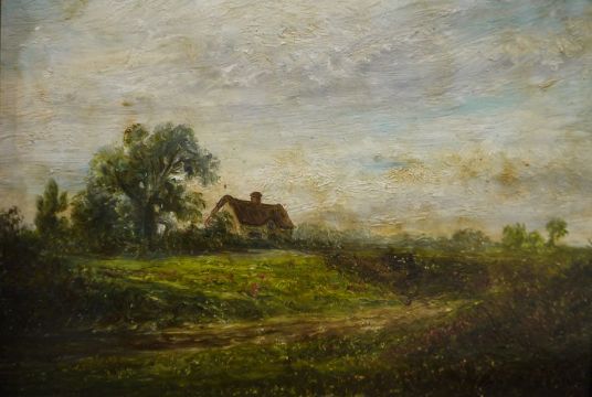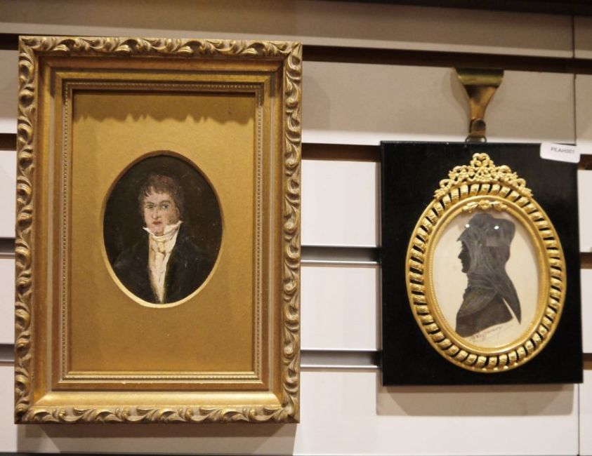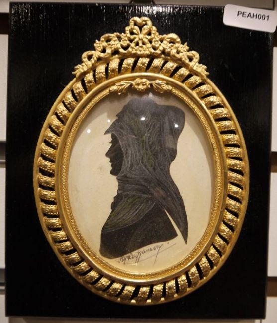 Kate Delhanty Oil on boardStill life - Vase of flowers, signed and dated '80, 13.5cm x 15cm, together withUnattributedOil on boardCottage in rural landscape, 19cm x 24cm, together withUnattributedOil on cardRegency style portrait miniature, oval, head and shoulders of a gentleman, 9cm x 7cm and aCut card and crayonFemale portrait silhouette of Elizabeth Holdsworth Hope, indistinctly signed, oval and with pierced gilt metal surround with ribband surmount, 13cm x 10cm on black painted wood mount (4)