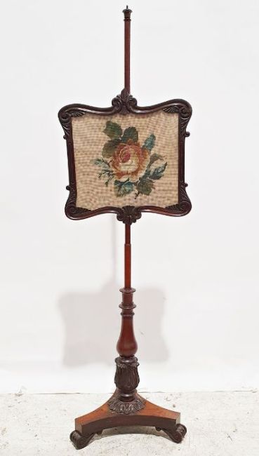 19th century rosewood needlework polescreen with floral spray, on baluster turned and carved column to triform base