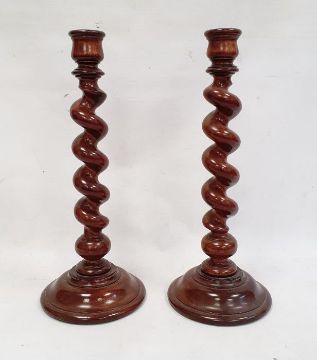 Pair of stained and turned wood candlesticks, each with spirally turned column, 44cm high (2) Condition ReportThere do not appear to be any repairs - we cannot guarantee