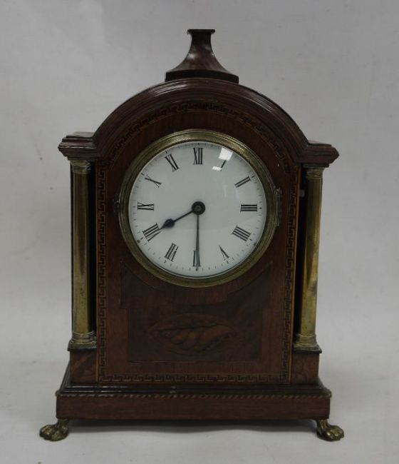 19th century mahogany-cased mantel clock with Roman numerals to the dial, inlaid shell decoration, brass paw feet, 30cm high