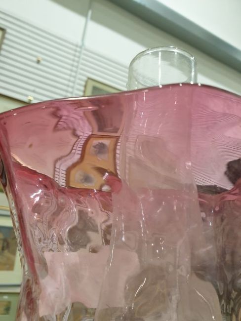 Cranberry and brass oil lamp having panelled flared shade, cranberry well, on reeded column, square baseCondition ReportPolish residue and fouling throughout.Scratches to glass shade.