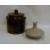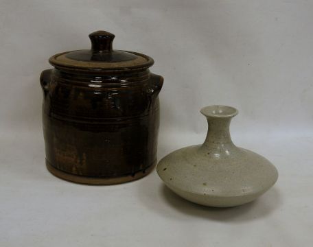 Studio pottery vase in light grey, circular flared shape (no markings to base), 20cm high and a brown glazed studio pottery lidded two-handled pot, 33cm high approx. (2)