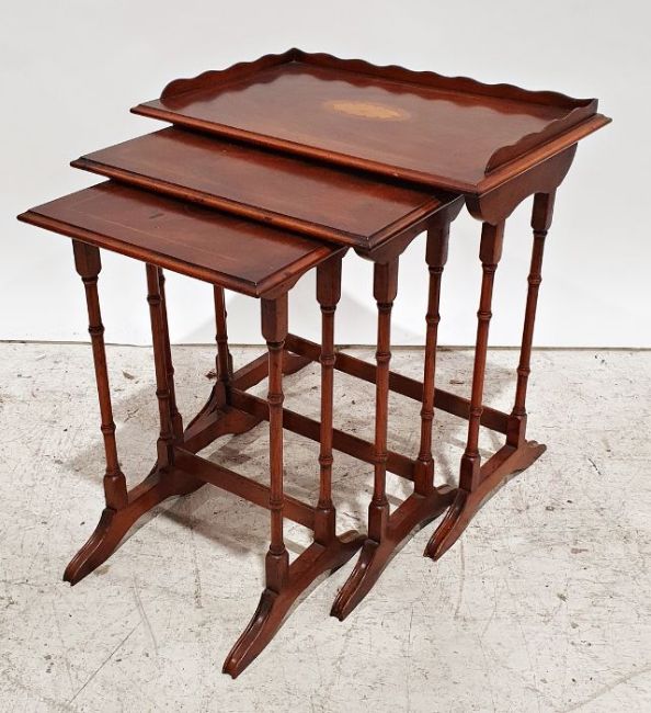 20th century mahogany and inlaid nest of three tables, the largest table with three-quarter galleried top