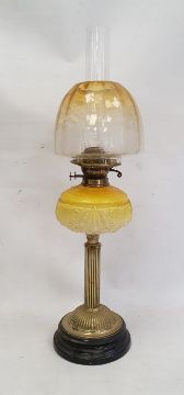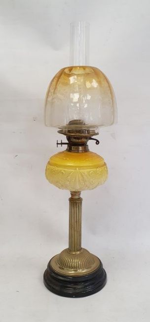 Victorian yellow glass and brass oil lamp, having amber and clear shade, mottled yellow well, with festoon decoration on reeded base Condition ReportCrack with substantial loss to bottom of shade. Marking and polish residue throughout. General wear.Well or fount appear to be okay, with no obvious cracks.