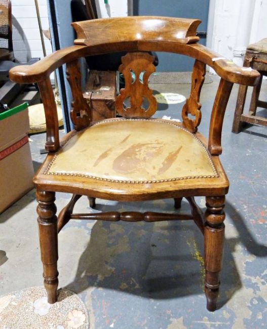 Elm captain's type chair with carved and pierced backsplat, serpentine fronted seat and turned supports, stretchered base