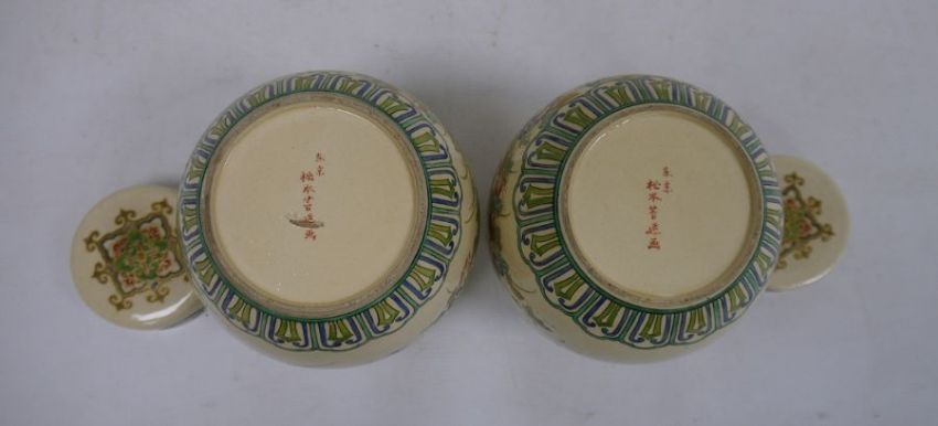 Pair Japanese earthenware vases and covers, ovoid, decorated with birds and floral sprays, inscription to base, 19cm high (2)
