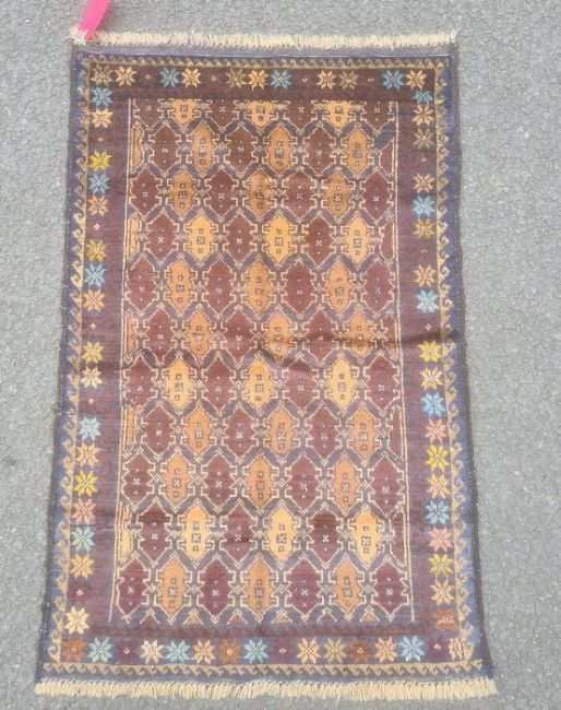 Baluchi rug, the central field decorated with brown lozenges within blue borders and within a floral border, 130cm x 82cm.