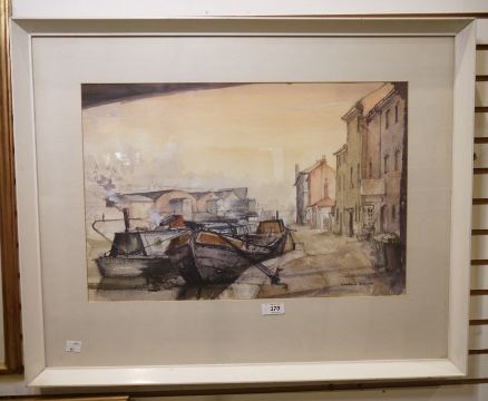 Graham Blaine (20th century school)Watercolour 'Gas Street Basin', Boats moored in Birmingham canal, signed lower right, 34cm x 51cm