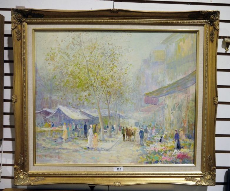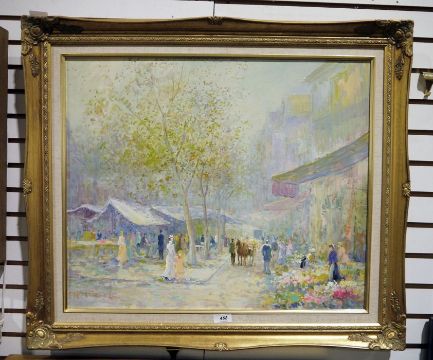 Late 19th/early 20th century schoolOil on canvasMarket scene with flowers, signed indistinctly lower left 'T.Pencke' 49 x 59 cm