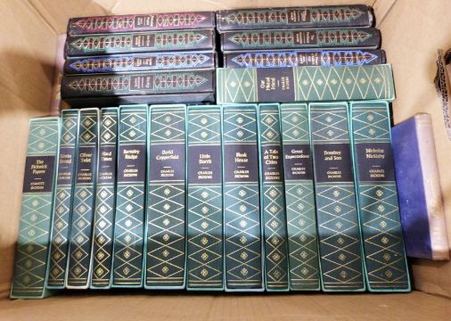 Assorted books including folio society titles including E M Forster 'Howard's End', published by Folio Society, Evelyn Waugh 'Scoop', published by Folio Society, bound volumes of Bronte Sisters volumes, Charles Dickens, etc (3 boxes)