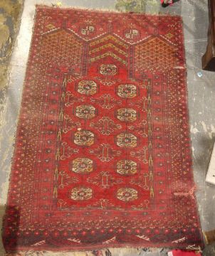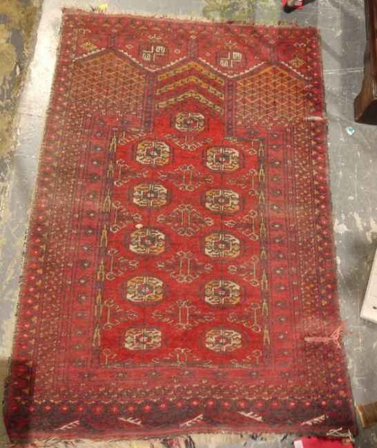 Red ground Eastern rug with five elephant's foot guls to the central field, stepped border, 110cm x 79cm, a red ground Eastern rug with elephant's foot gul decoration, 108cm x 75cm and a red ground Eastern-style rug, the central field with ten elephant foot guls, stepped border, 117cm x 82cm , plus one further rug (4)