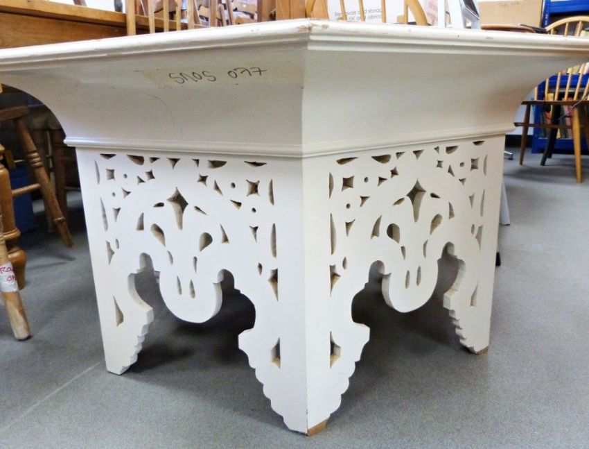 ********* WITHDRAWN ************ 20th century cream painted coffee table with hexagonal top, carved and pierced base, 106cm x 60cm ************ WITHDRAWN **********