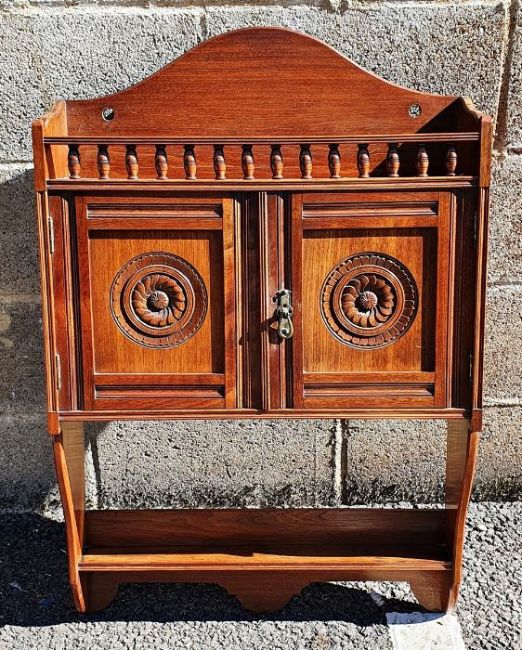 James Shoolbred of London wall-hanging cabinet, the arched back above spindle turned gallery, two cupboard doors with carved roundel decorations and narrow shelf under, plaque to back marked 'James Shoolbred, Tottenham House, Tottenham Court Road, London' and stamped '7278'