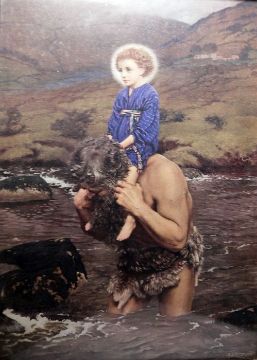 Painted, burrwood and ebonised wood door panel withFigure of a horn player, 63cm x 38cmEdwardian colour print St Christopher, in Art Nouveau-style wooden frame (2)