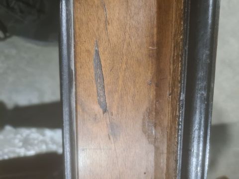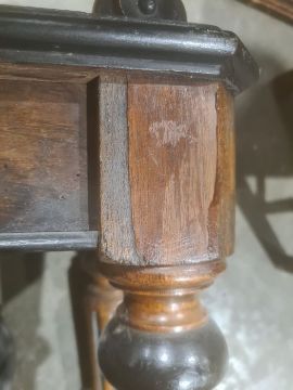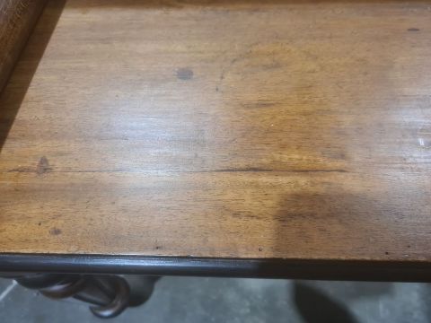 Walnut window seat with scroll ends above the rectangular top with canted corners, on turned and fluted supports, 112cm wide approx. Condition ReportSmall surface crack to top as well as some staining. The top appears to be peeling a bit in the centre. There are several spots of loss around the edges of the top and a large section to one side. There is some wear in spots to the legs. There appears to be extensions added to all four feet. Please see further images.