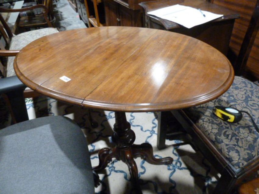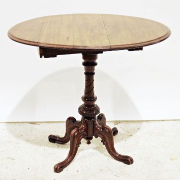 19th century mahogany drop-leaf table on turned and carved column to four ogee carved supportsCondition Report80 cms x 56 x 73 h. cms,  the table top swivels and is oval shaped