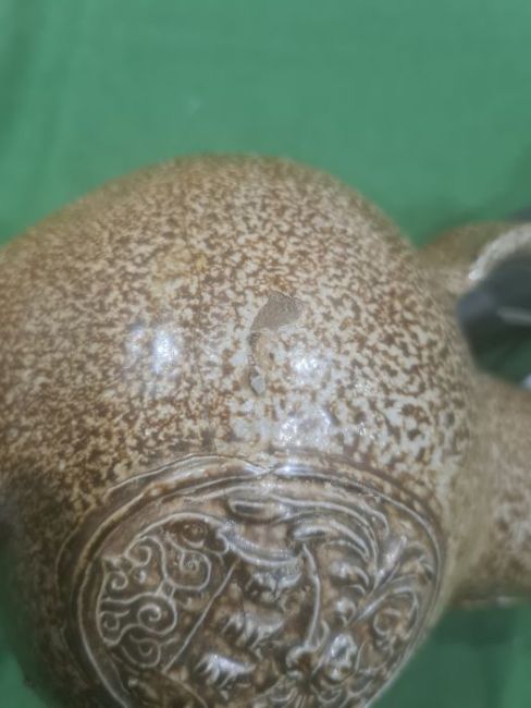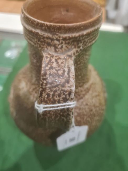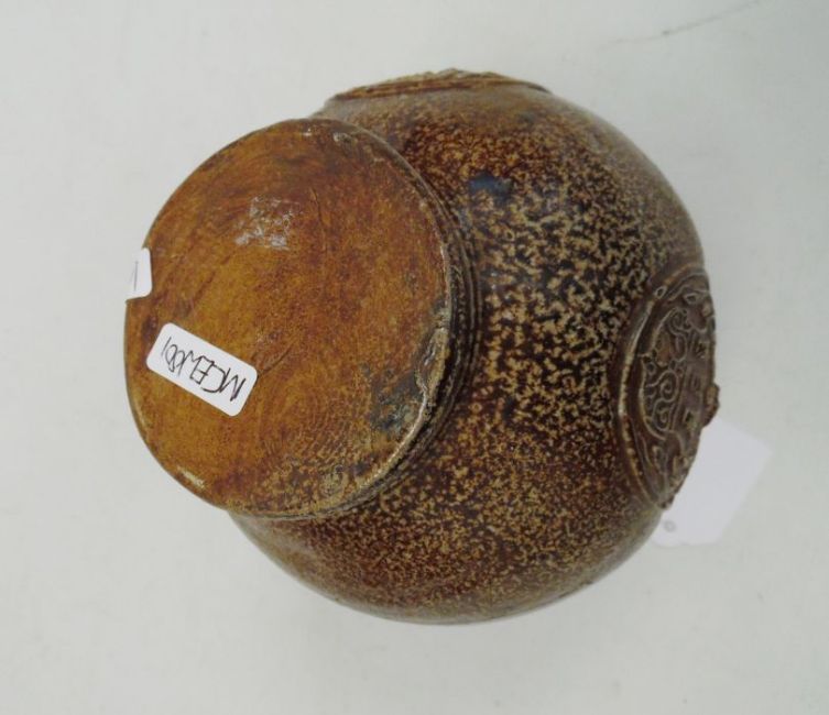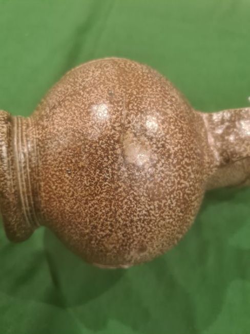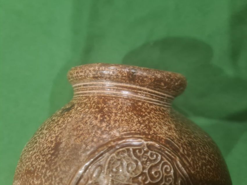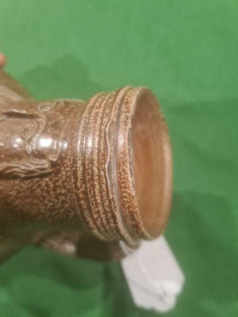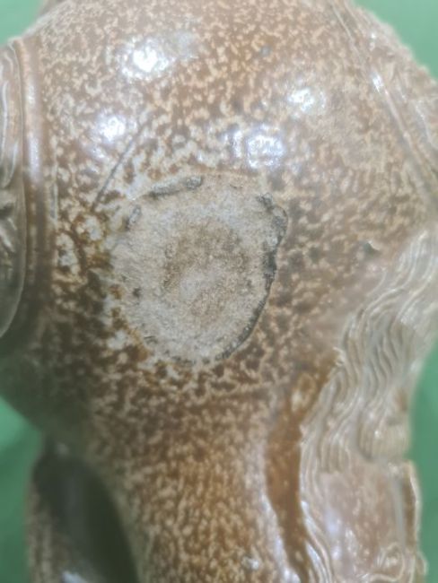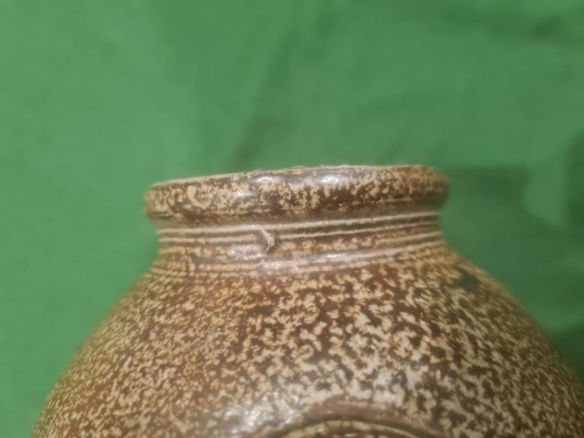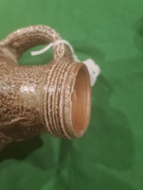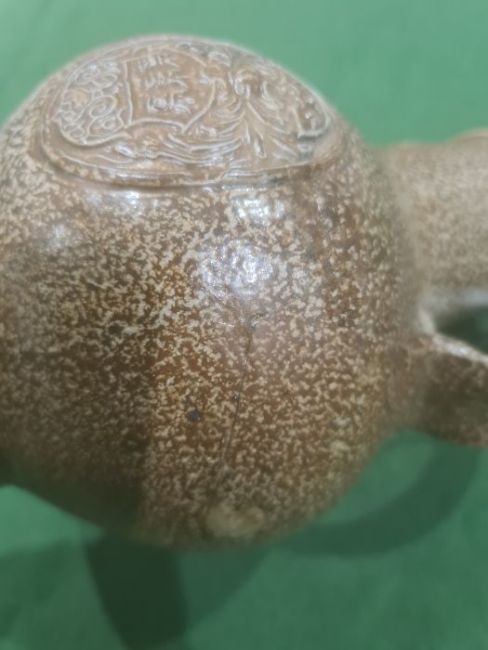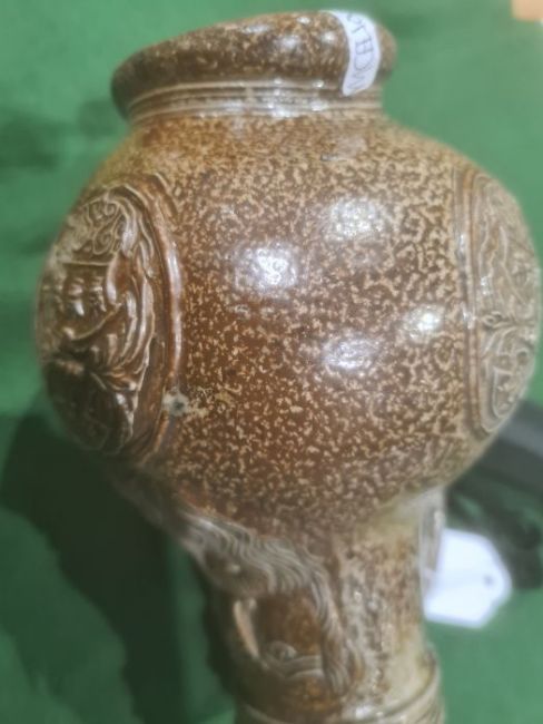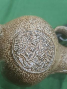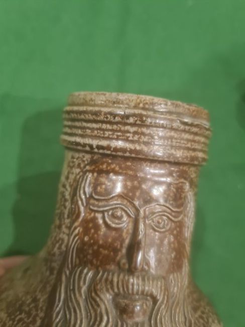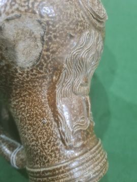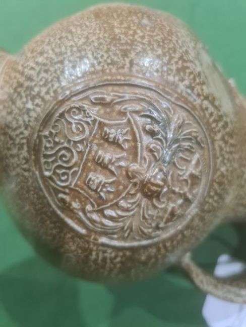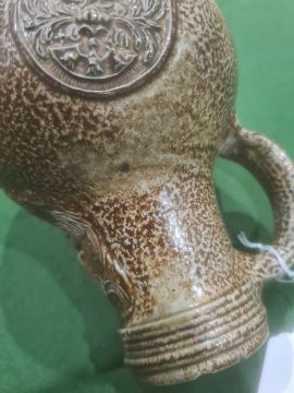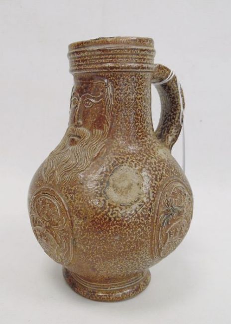 Rhenish stoneware bellarmine jug applied three continental crests in oval tablets, 20cm high Condition ReportBase Even. Long crack around back crossing about a third of the circumference. Some fading. Crack to top. Crack to base. 1 crest cracked and peeling off. Chip to back. Old repair to rim, chips to top. Large rough section insideIt has not been looked at under UV light. There is no apparent restoration how ever this is not a guarantee.