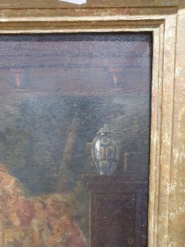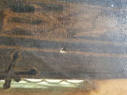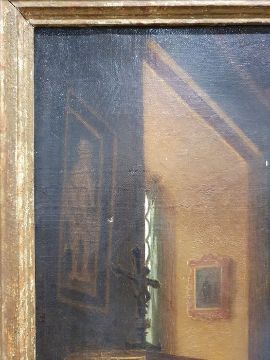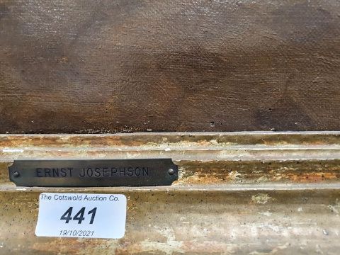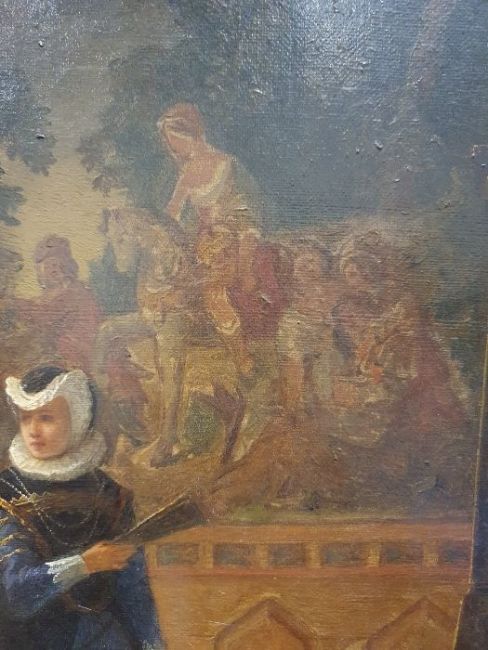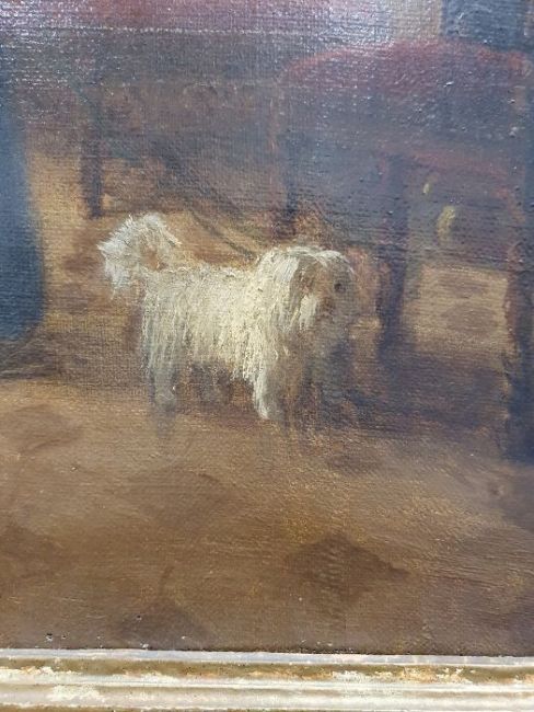 Attributed to Ernst Josefson (Swedish, 1851-1906)Oil on canvasInterior scene with tapestry and sumptuous furnishings, with lady in 16th century dress with dog, 54cm x 44cm Condition ReportSome accretions and what appear to be white paint spots to the left of the canvas. Small hole to the canvas on the left side.  Areas of overpainting/restoration under UV. Two small areas on the back where the canvas has been patched.  Minor crazing in places.
