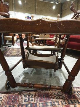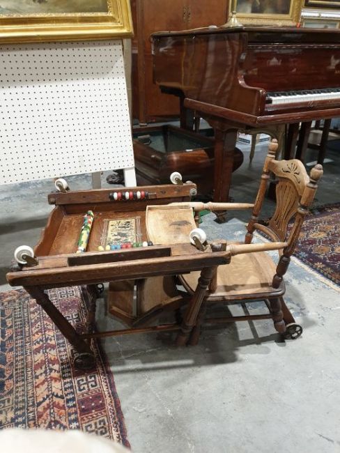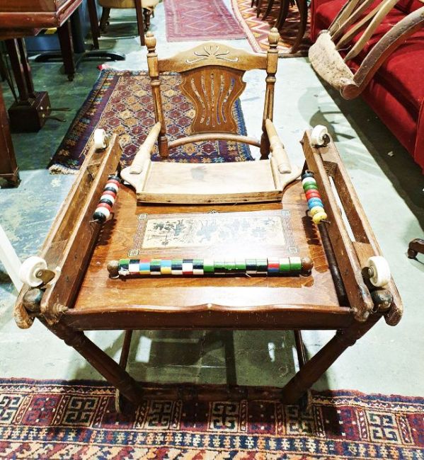Edwardian child's metamorphic high chair with tray decorated with black silhouette nursery scene, coloured beads, original metal wheels and replacement castors