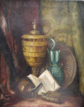Early 20th century school Oil on canvasStill life of books with urns, unsigned, labelled verso 'Purchased by B Harkin approx early 1920, Stowe, Lancroft Hall Near Bury St Edmonds, believed painted by Baroness Amphurst', unframed, 66cm x 53cm