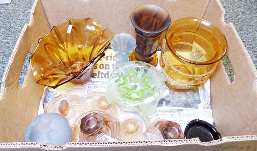 Orange glass centrepiece bowl, various Art Deco style glass items and a collection of paperweights