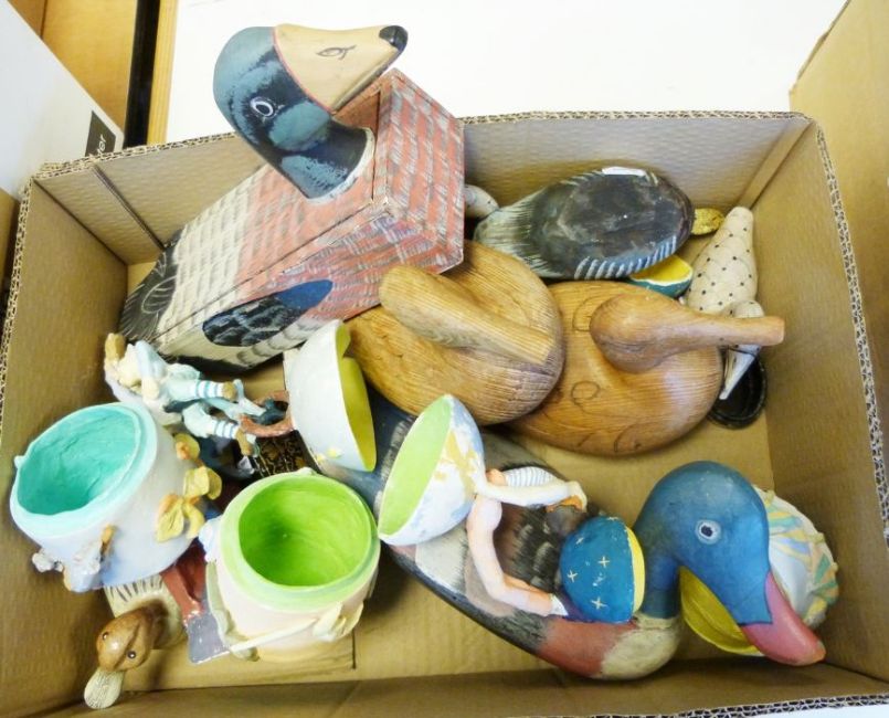 Pair of Pure Evoque One digital radios, various wooden models of ducks together with various china and household items (3 boxes)