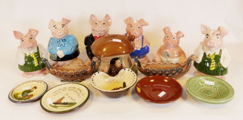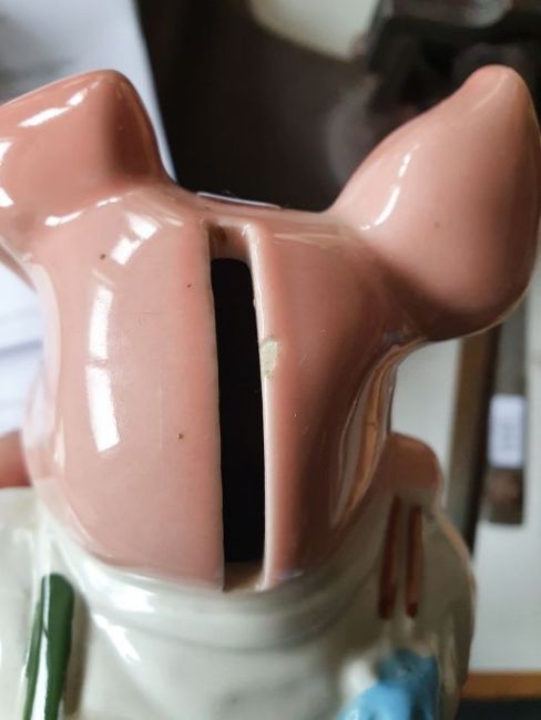 Small chip to the edge of the money slot on one pig. General wear and tear.