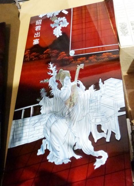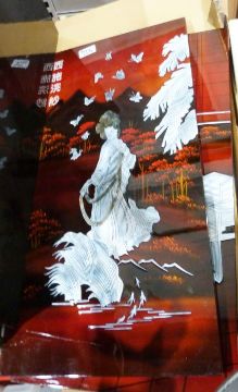 Four Japanese lacquered and mother-of-pearl panels of women together with two framed ceramic relief geishas (6)