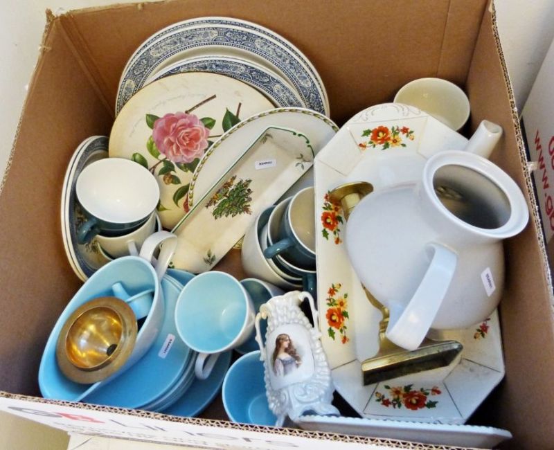 Poole pottery cups and saucers, a brass teapot, glass witch's ball together with various glass and chinaware (2 boxes) (DOLL NOT INCLUDED)