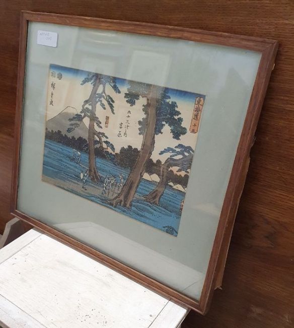 Print of a tall mast ship together with a Japanese woodblock print, a further print and three mirrors (6)