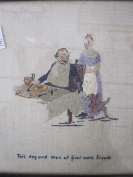 Early 20th century circular embroidered picture of coastal scene, dated August 1930 to reverse, 22cm diameter, an embroidered picture 'This Dog and Man First Friends', 18.5cm x 17cm, four miniature embroidered pictures and an oval embroidered picture of a lady in a purple dress (7)