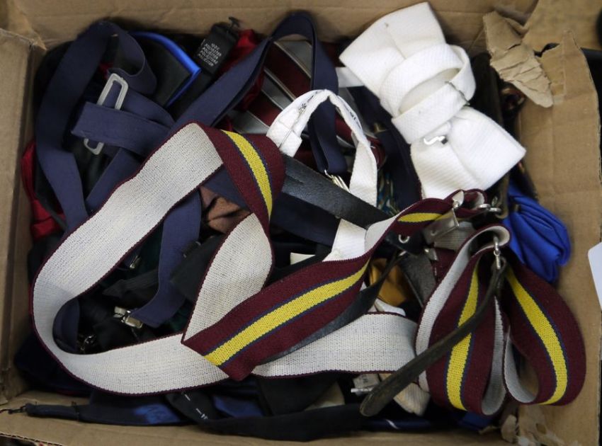 Vintage gent's ties, scarves, belts, tweed caps, braces, etc (2 boxes) Condition Reportplease see images - the blue of the " Gunner's'" tie is dark blue not turquoise! and I am not sure if authentic