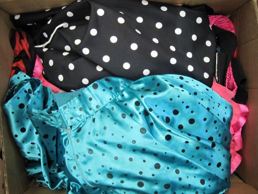 Quantity of theatrical costume for a production of Grease to include satin skirts, net petticoats, belts, scarves, baseball jackets, etc (1 box)  there are now two boxes