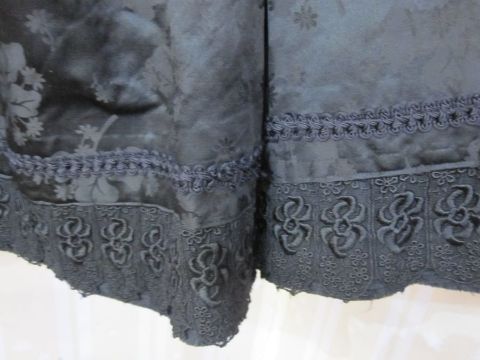 Victorian black printed satin skirt with button, rickrack and lace detail and a Victorian black satin bustle skirt trimmed with lace (2)