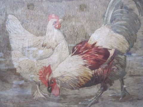 19th century embroidery of a cockerel with chicken, signed indistinctly lower left, 18cm x 23cm and another embroidered picture of cockerel with chicken, 18cm x 21.5cm (2)