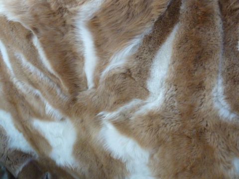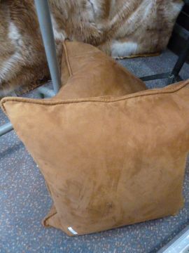 Guanaco (llama) fur throw backed by gold-coloured satin, labelled 'Hockley', 231cm x 241cm and two faux-suede cushions, 57cm x 57cm which match the edging of the throw (3)