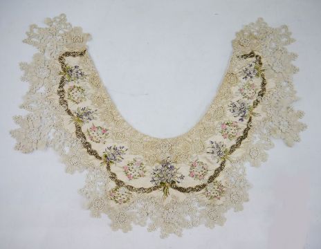 Victorian lace and embroidered collar, the embroidery showing bunches of flowers and ribbons, ??? beads and gold-coloured bugle bead decoration, backed onto satin, possibly more recently with recent copper fixings