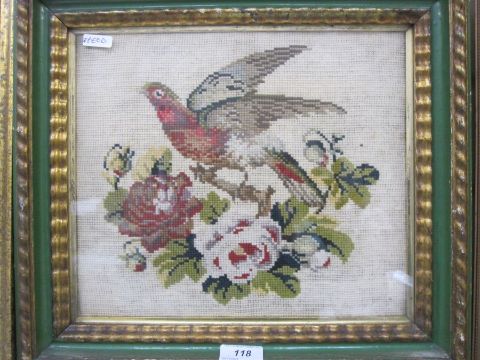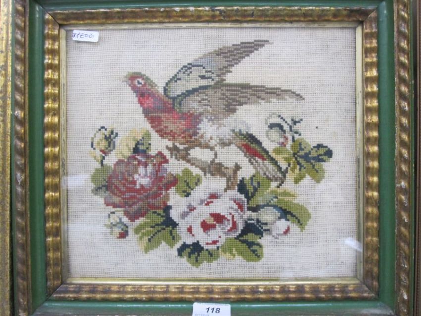 Early 20th century tapestry of bird amongst roses, 24cm x 28cm