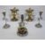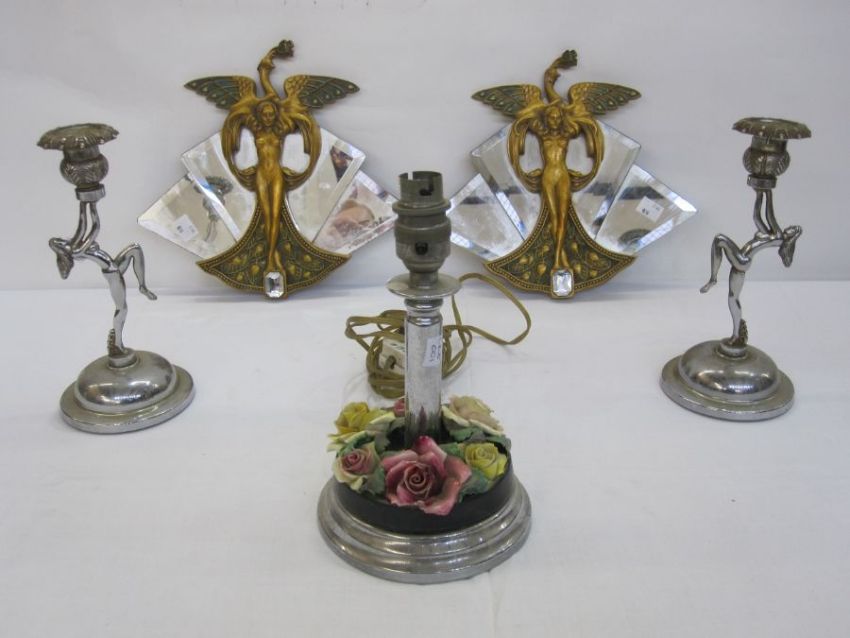 Pair Art Deco white metal candlesticks, each with foliate sconce supported by nude female figure on domed base, 21.5cm high approx., a 20th century white metal and ceramic rose-encrusted table lamp and a pair of modern Deco-style mirror panels (5)