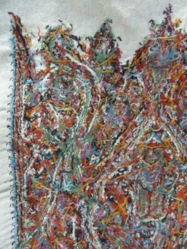 Paisley Kashmiri shawl, embroidered pattern on each side reversed,  so has to be folded with both good sides together, 227cm x 147cm (repairs and some moth damage in the centre),  Please check the photographs carefully and contact the auctioneer for more detail.