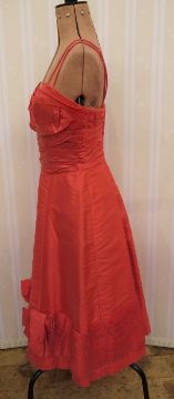 1950's/60's cocktail dress in dark pink satin with pintuck and bow detail to the hem, ruched bodice and double spaghetti straps