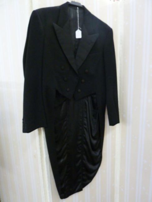 A Burberry trench coat,  ( the dressinggowns are now lot 348A a silk chinese style embroidered dressing gown, a chinese style silk gentleman's dressing gown and belt,) and a   gentleman's vintage black tailcoat (2 only now in the lot) Condition ReportThe Burberry mac is fair/good, the chinese style silk embroidered dressing gown has wear, the gentleman's dressing gown is fair, the tail coat needs cleaning