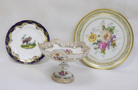 Continental Meissen-style pedestal bowl with floral decoration, a Minton decorative plate and a handpainted tray marked 'Limoges Jammet-Seignolles' (3)