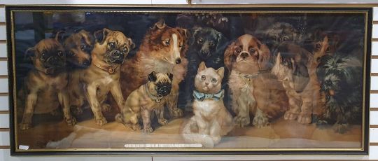 British school 20th century (after Louis Wain)Oil on canvas"For what we are about to receive", signed with monogram and dated lower right, 14cm x 49cm