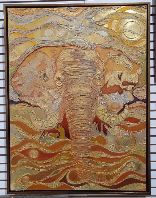 21st Century schoolOil and mixed media on canvasElephant in golden hues, signed indistinctly verso, 100cm x 76cm