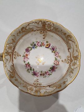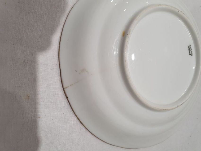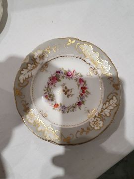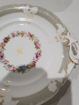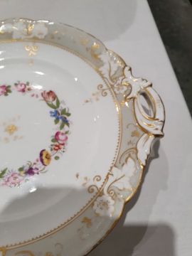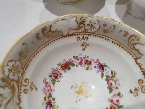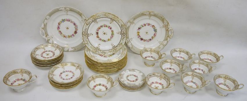 Late nineteenth century porcelain teawares by Cauldon, floral decorated with gilt highlights to include teacups, saucers, plates, etc Condition ReportSubstantial wear to the gilt on small plates, surface scratches and one with a chip. Saucers have wear to the gilt, surface scratches and three of them have hairline cracks. Dinner plates have wear to the gilt, surface scratches, accretions and one has a crack. Eared serving plates have heavy wear to the gilt, surface scratches, accretions. All have wear and tear, see photos.